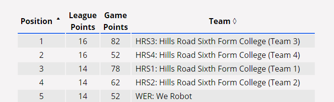 We have entered 4 teams (HRS1, HRS2, HRS3, HRS4). They all worked hard over the Christmas break to upload the code for the first league session. This was a massive success. HRS3 came in first winning all of their matches and leading with a staggering 82 league points. What’s better is the next 3 places were all the other Hills Road teams.